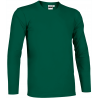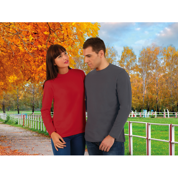 Dupla costura na gola, bainha e mangas.