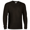 Dupla costura na gola, bainha e mangas.