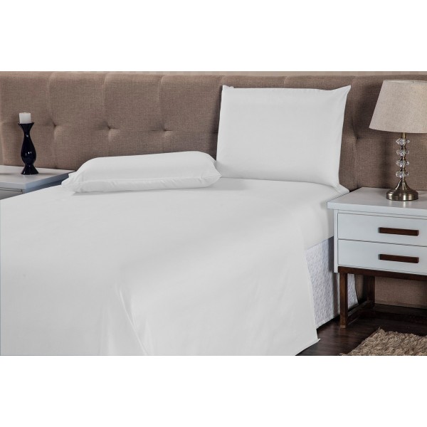 Toalha de mesa branca anti-nódoa com bainha simples com cantos sobrepostos.