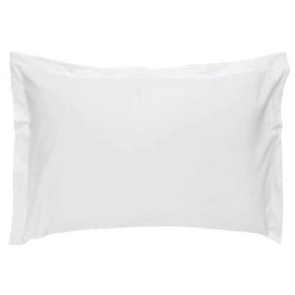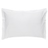 Toalha de mesa branca anti-nódoa com bainha simples com cantos sobrepostos.